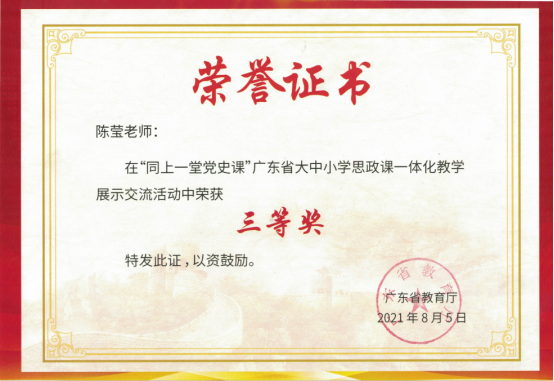 我部陈莹老师在2021年广东省教育厅举办的“同上一堂党史课”广东省大中小学思政课一体化教学展示交流活动中喜获三等奖。本次教学展示交流活动为贯彻落实习近平新时代中国特色社会主义思想和总书记关于学校思政课建设的重要论述和在党史学习教育动员大会上的重要讲话精神,突出庆祝建党100周年主题,组织全省大中小学思政课教师开展的主题为庆祝建党拜年·同上一堂党史课,并为共同推进党史教育融入思政课堂,推进大中小学思政课一体化建设。