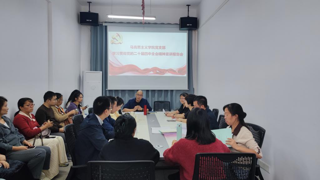 11月13日,马克思主义学院在教研楼506会议室召开学习贯彻党的二十届四中全会精神宣讲报告会。马克思主义学院副院长黄佳旭以专题报告形式,为全院教师重点解读全会精神,推动党的创新理论进校园、进课堂、进头脑。